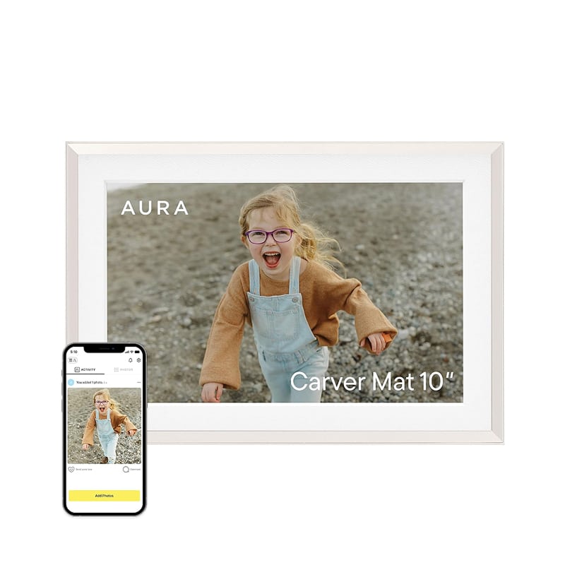 Le Cadre Photo Numérique Aura Carver se positionne comme un concurrent sérieux avec une réputation exceptionnelle, étant recommandé par des publications prestigieuses comme The New York Times/Wirecutter et Wired. Ce cadre intelligent de 10,1 pouces offre une expérience premium avec son écran HD calibré en couleur et son design élégant disponible en blanc avec bordure.