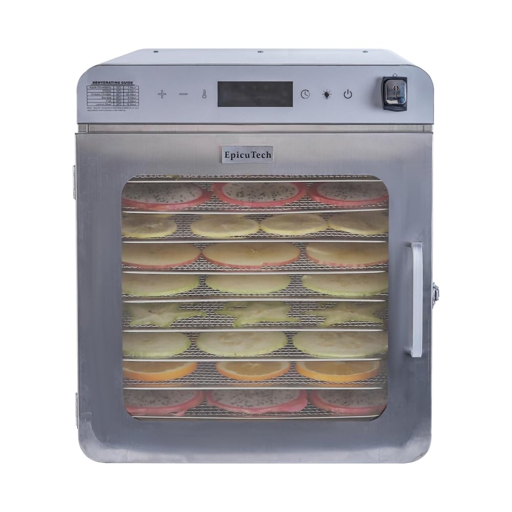 Le déshydrateur EpicuTech impressionne par son immense espace de séchage de 15,19 pi² réparti sur 10 plateaux en acier inoxydable. Son écran tactile numérique permet un contrôle précis de la température (jusqu'à 194°F) et du temps (minuterie 24h).